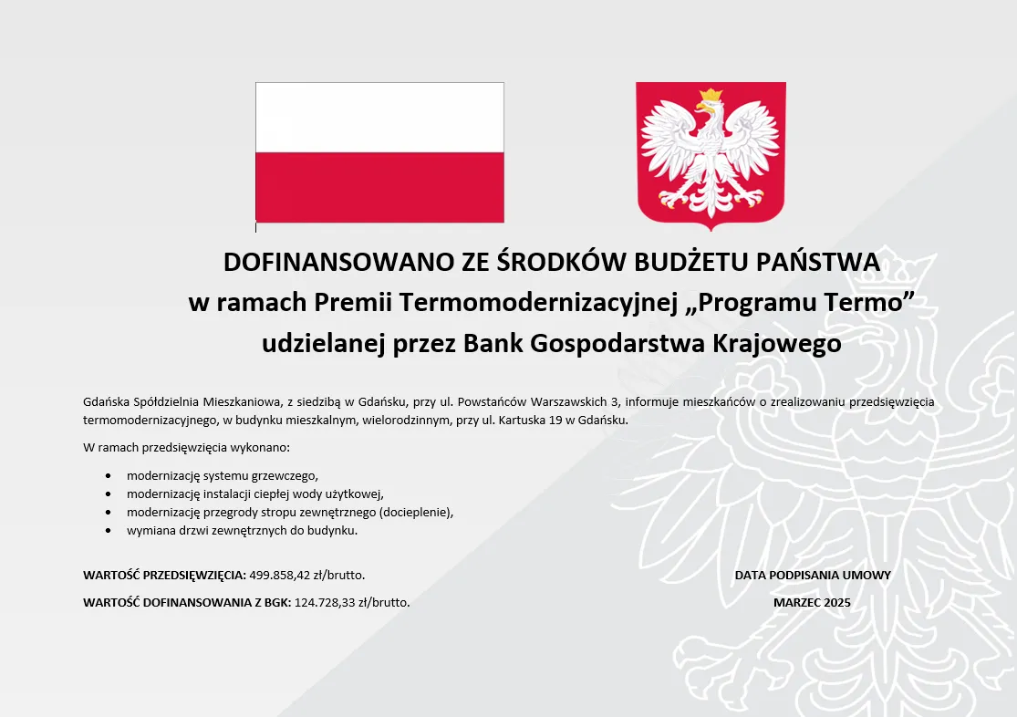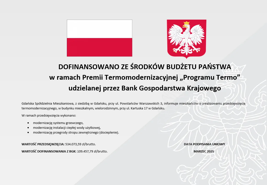 Gdańska Spółdzielnia Mieszkaniowa z siedzibą w Gdańsku przy ul. Powstańców Warszawskich 3, uprzejmie informuje wszystkich mieszkańców o zrealizowaniu przedsięwzięcia polegającego na „Montażu Paneli Fotowoltaicznych z pompą ciepła”, w ramach programu Krajowy Plan Odbudowy, sfinansowanego przez Unię Europejską Next Generation EU.